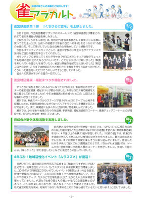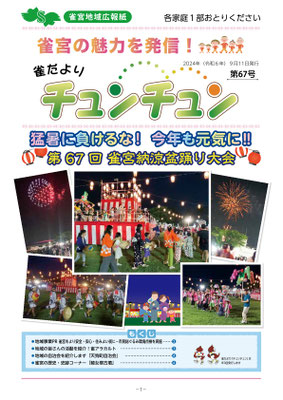 地域活動の一環として、令和6年9月14日(土)に雀宮中学校の3年生39名と教員・PTA・ボランティアネットワーク会員・雀宮まちづくり推進協議会・雀宮消防団・防犯協会・雀宮地区センター職員など80名が参加して「清掃活動」が行われました。参加者は午前8時20分に雀宮地区センターに集合、開会式の後6班に分かれ新幹線高架下・雀宮地区センター周辺・雀宮児童公園などのごみ拾いや除草・清掃などを行いました。1時間程で作業は終了し、センタ-に運びこまれたゴミ袋は30袋になりました。参加された生徒より、新幹線高架下には私が想像していた以上のごみや雑草があり、この短い時間できれいにすることができるのか不安に思いましたが、ボランティアに参加した人たち全員で清掃をしたことで、たくさんのゴミ袋をいっぱいにする事ができました。こらは誰か一人だけの力ではできず、多くの人がいたからこそできたことです。この経験から、これから一人では難しいことに挑戦し、行動していこうと思います。とメッセージを頂きました。