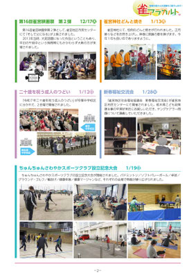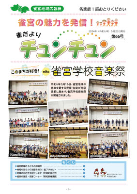 2月18日(日)、雀宮地区青少年育成会主催の「チュンチュン子どもフェスタ」が雀宮地区市民センターにて4年振りに開催され、地域の子どもたちや親子連れなど500人を超える来場者で賑わいました。朝から快晴に恵まれた会場では、新田お囃子会の和太鼓の演奏で幕を開け、雀宮中央小学校の6年生2名の挨拶の後、「南中ソーラン(雀宮中央小学校)」「しんでんキッズダンス(新田小学校)」「マーチング演奏(雀宮南小学校)」「合唱(雀宮中学校合唱部)」などのアトラクションが行われ、観客から盛んな拍手を浴びていました。